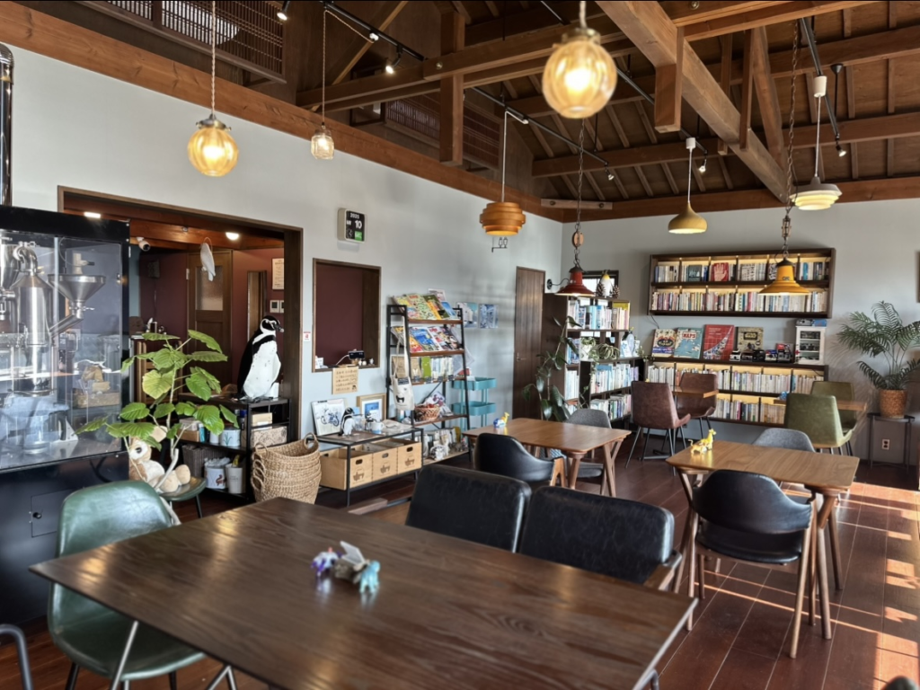 こちらも大三島で移住者のご夫婦が営む、こだわりが詰まったお店。木の温もりの店内、壁にある本棚から本をとって読むこともできます。窓の外には穏やかな海。こんな景色を毎日見ていたら心があらわれそうです。