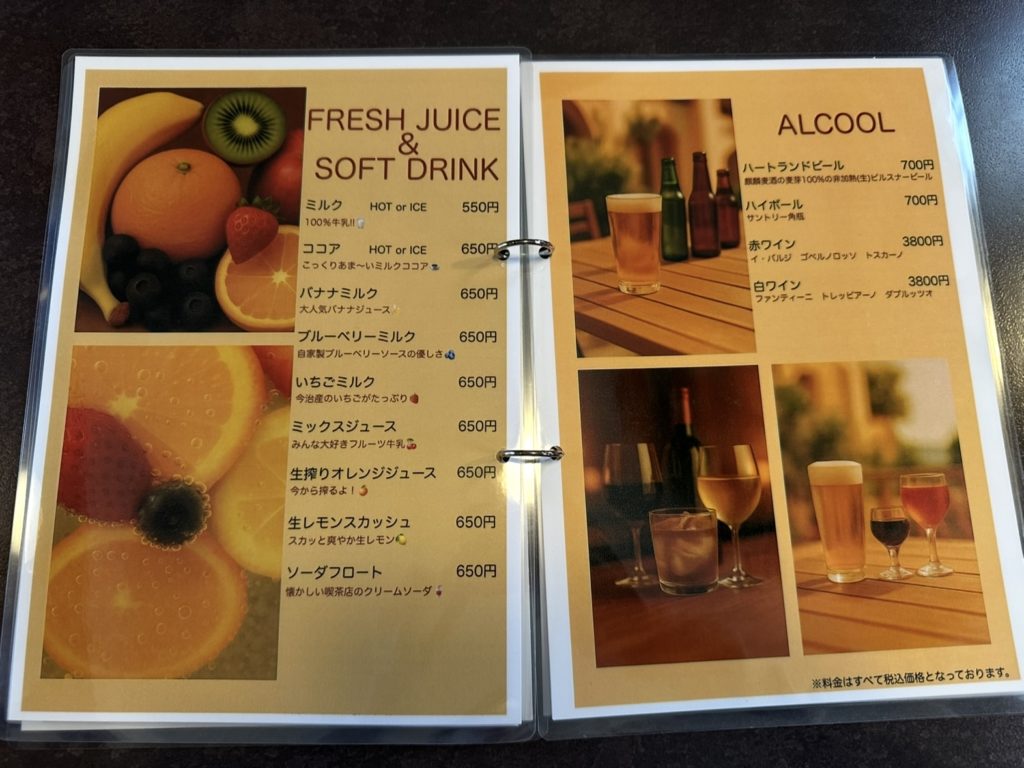 生絞りオレンジジュースや今治産のいちごがたっぷり入ったいちごミルクもおいしそう。