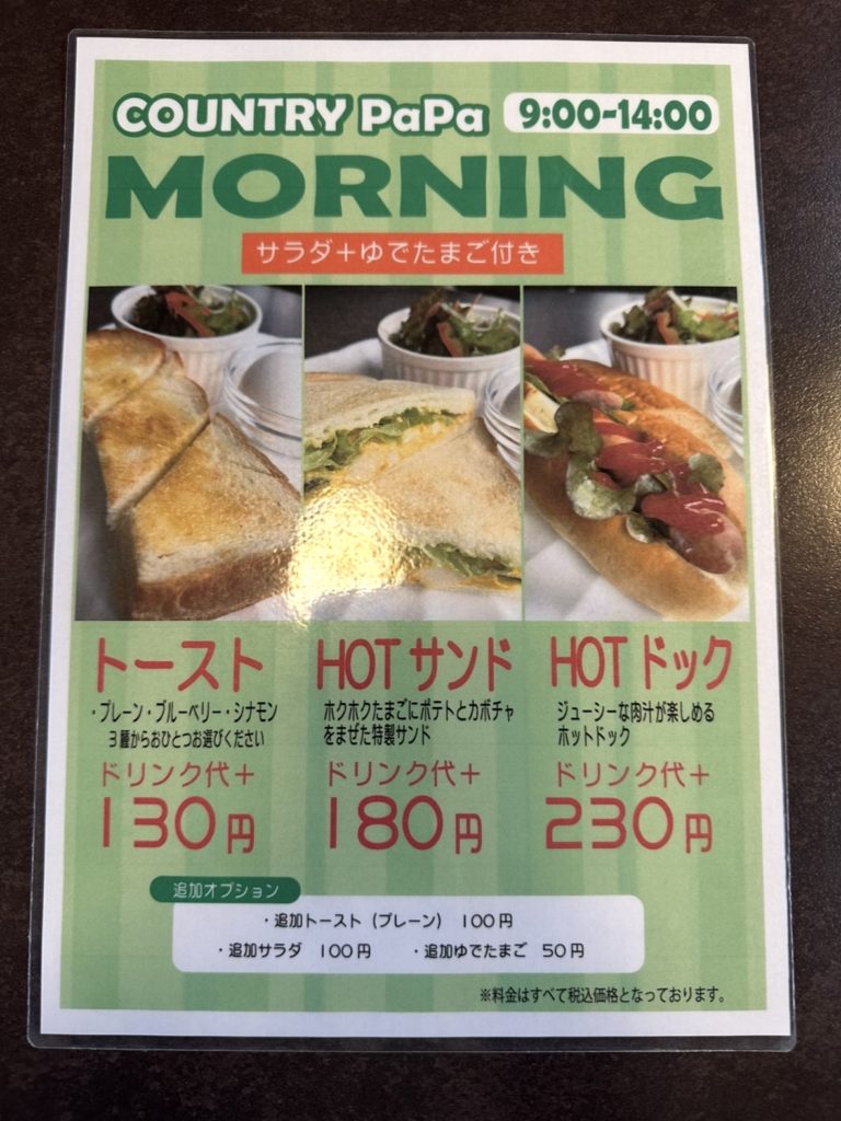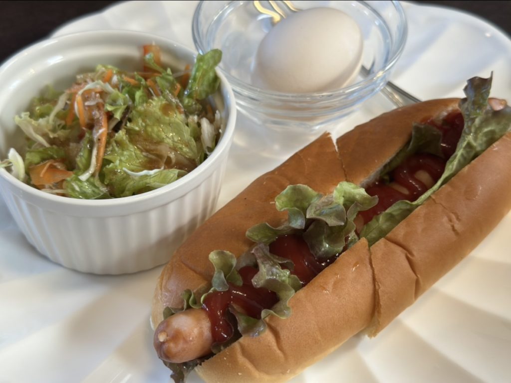 Takaのモーニングセットはホットドッグとゆでたまごとサラダとカフェオレ。