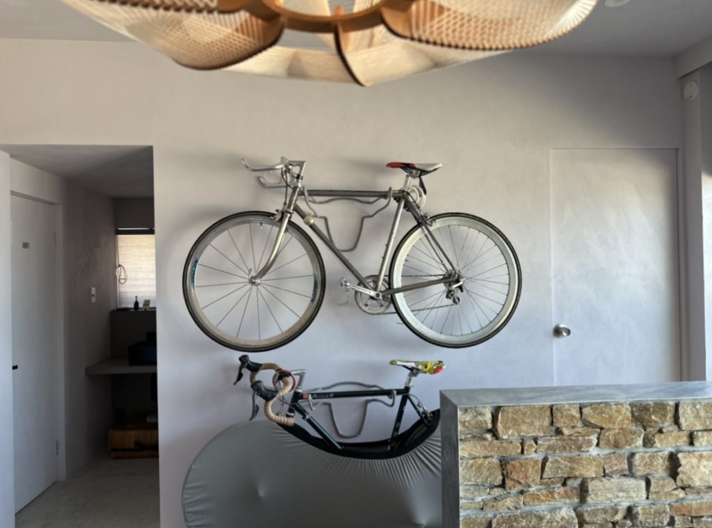 店内の壁には尾形さんと奥様の自転車がかかっています。