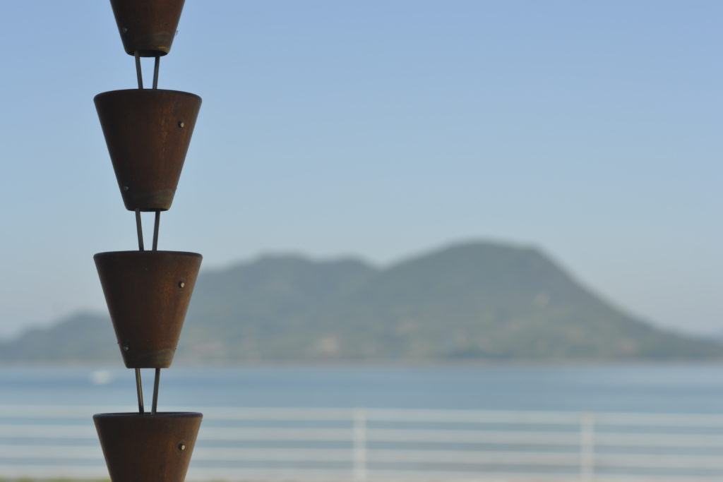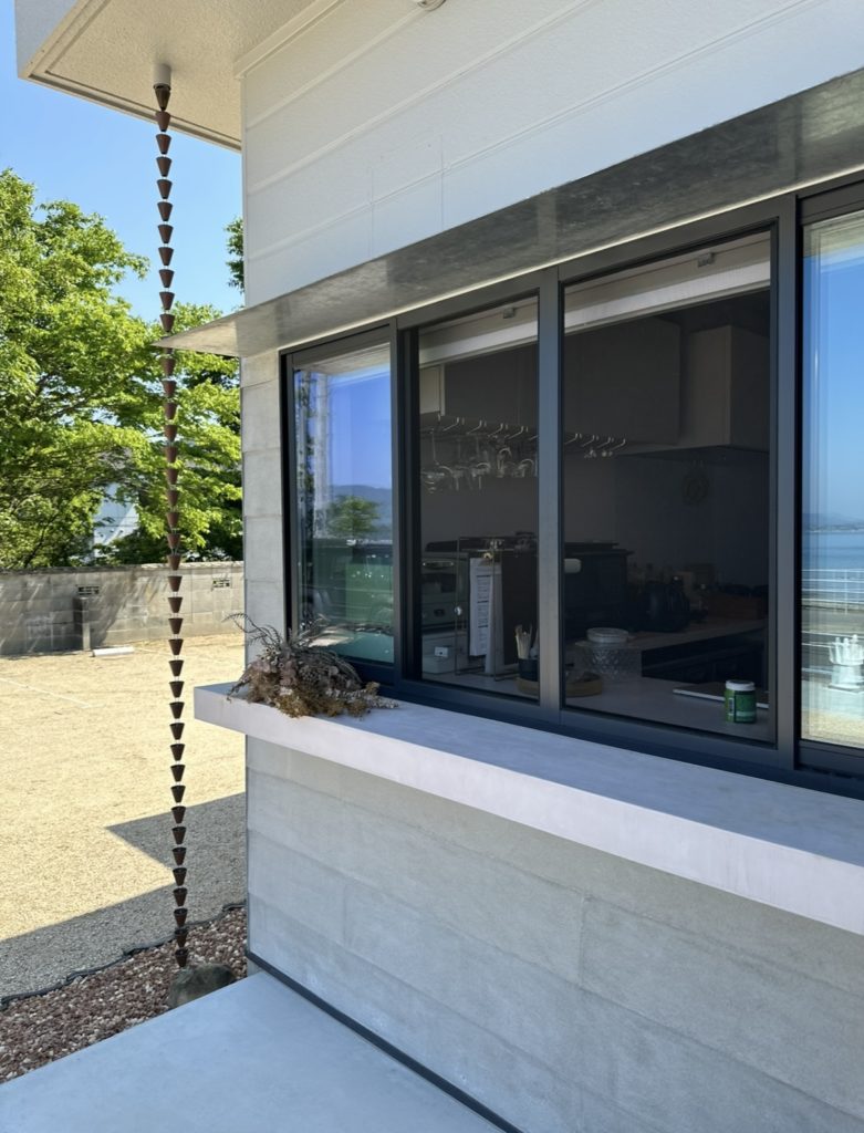 尾形さん「いっぱいあります(笑)。モダニズム建築という20世紀初頭に生まれた建築様式が好きなのですが、モダニズム建築の特徴である岩壁や、雨が伝う雨樋(あまどい)など、色々。今は雨樋自体、ない建物も多いですが、雨の日の大三島も魅力的なので、その良さを感じていただきたいと思って銅の雨樋をつけました。雨樋の下に岩があって、そこに雨が落ちる時にすごくいい音がするんですよ。ちなみにあの岩は前の海から拾ってきました。」